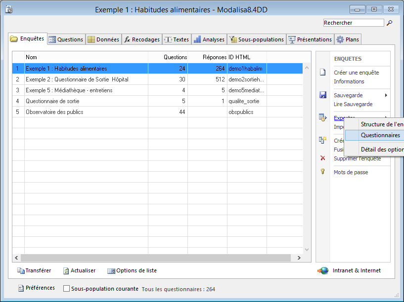 Par défaut, tous les questionnaires sont exportés. Il est possible de ne prendre qu’une sous-population.
